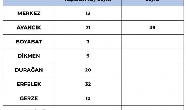 Sinop'ta kar yağışı dolayısıyla 196 köy yolu ulaşıma kapanırken, 39 köye ise elektrik verilemiyor. Sinop'ta etkili olan yoğun kar yağışı özellikle kırsalda hayatı felç etti. Sinop'un toplam 465 köy yolundan yarısına yakını ulaşıma kapandı. 02 Ocak Cuma günü saat 10.00 itibarıyla hazırlanan Kar Kısıtlılığı Tablosuna göre, il genelinde kardan dolayı 196 köy yolunun ulaşıma kapalı olduğu bildirildi. İlçelere göre kapalı köy yolu sayıları; Merkez 13, Ayancık 71, Boyabat 7, Dikmen 9, Durağan 20, Erfelek 32, Gerze 12 ve Türkeli 32 olarak kaydedildi. Öte yandan kar yağışı ve olumsuz hava koşulları nedeniyle 39 köyde enerji kesintisi yaşandığı belirtildi. Kesintilerin giderilmesi için ilgili ekiplerin sahada çalışmalarını sürdürdüğü ifade edildi. Valilikten yapılan açıklamada, İl Özel İdaresi başta olmak üzere tüm ekiplerin vatandaşların mağduriyet yaşamaması için yoğun çaba gösterdiği belirtilerek, sürücülerin buzlanma ve olumsuz hava şartlarına karşı dikkatli olmaları istendi.