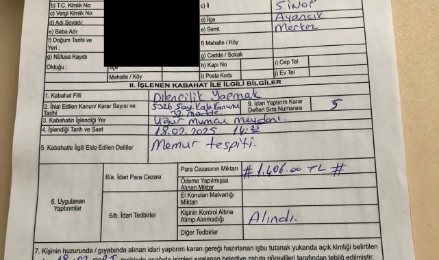 Sinop Belediyesi zabıta ekipleri vatandaşların iyi niyetlerini, dini ve vicdani duygularını sömürerek haksız kazanç elde eden dilencilere yönelik operasyon düzenledi. Uğur Mumcu Meydanı'nda ve Kapalı Pazaryeri'nde dilencilik yapan şahıslar Sinop Belediyesi Zabıta Amirliği ekiplerince yakalandı. Yakalanan şahısların üzerinden çıkan para belediye encümeni kararı ile kamuya geçirilirken, şahıslara Sinop Belediyesi Zabıta Amirliği ekipleri tarafından Kabahatler Kanunu 33. Maddesi gereği idari para cezası uygulandı.
