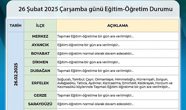 Valilikten yapılan duyuruya göre, Ayancık, Dikmen ve Türkeli ilçelerinde eğitim-öğretime tamamen ara verildi. Bunun yanı sıra, Merkez ile Durağan ve Gerze ilçelerindeki köylerde ise sadece taşımalı eğitim yapılmayacak.