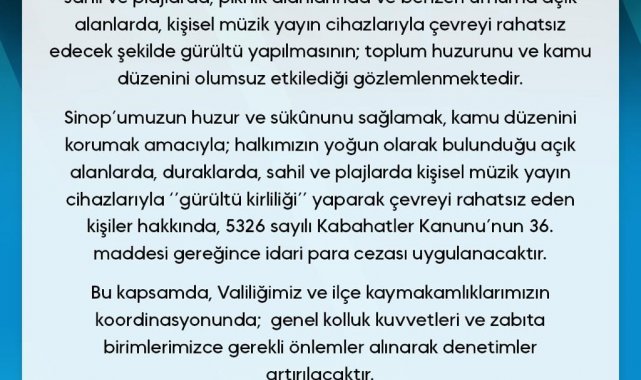 Valilik tarafından yapılan açıklamada, "Son dönemde; kişisel araçlarda, duraklarda, sokaklarda, caddelerde, seyir halindeki araçlarda, düğün konvoylarında, sahil ve plajlarda, piknik alanlarında ve benzeri umuma açık alanlarda, kişisel müzik yayın cihazlarıyla çevreyi rahatsız edecek şekilde gürültü yapılmasının; toplum huzurunu ve kamu düzenini olumsuz etkilediği gözlemlenmektedir. Sinop'umuzun huzur ve sükûnunu sağlamak, kamu düzenini korumak amacıyla; halkımızın yoğun olarak bulunduğu açık alanlarda, duraklarda, sahil ve plajlarda kişisel müzik yayın cihazlarıyla "gürültü kirliliği" yaparak çevreyi rahatsız eden kişiler hakkında, 5326 sayılı Kabahatler Kanunu'nun 36. maddesi gereğince idari para cezası uygulanacaktır. Bu kapsamda, Valiliğimiz ve ilçe kaymakamlıklarımızın koordinasyonunda; genel kolluk kuvvetleri ve zabıta birimlerimizce gerekli önlemler alınarak denetimler artırılacaktır. Sinop'umuzun huzuru için yapılacak olan bu uygulamaya vatandaşlarımızın destek vermeleri önem arz etmektedir" denildi.