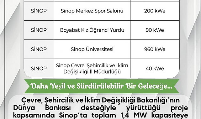 Uygulama kapsamında Sinop Gençlik Merkezi, Sinop Merkez Spor Salonu, Boyabat Kız Öğrenci Yurdu, Sinop Üniversitesi ve Sinop Çevre, Şehircilik ve İklim Değişikliği İl Müdürlüğü binalarına yerleştirilen güneş enerjisi santralleri ile elektrik üretimi yapılacak.