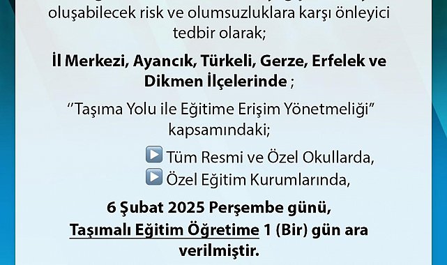 Sinop Valiliği'nden yapılan açıklamada, ''İlimiz genelinde etkili olan kar yağışı nedeniyle, oluşabilecek risk ve olumsuzluklara karşı önleyici tedbir olarak; il merkezi, Ayancık, Türkeli, Gerze, Erfelek ve Dikmen ilçelerinde; 'Taşıma Yolu ile Eğitime Erişim Yönetmeliği' kapsamındaki; tüm resmi ve özel okullarda, özel eğitim kurumlarında, 06 Şubat 2025 Perşembe günü, taşımalı eğitim- öğretime 1 gün ara verilmiştir'' ifadelerine yer verildi.