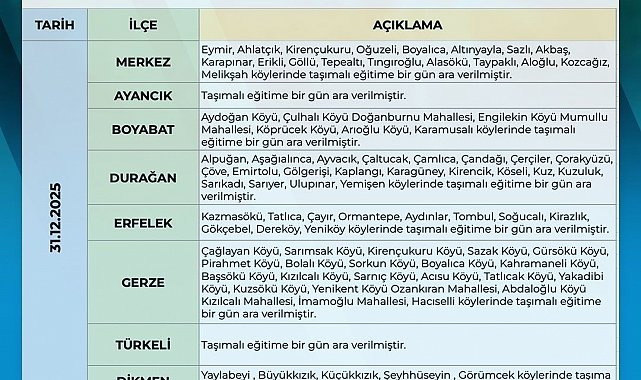 Valilik açıklamasında ayrıca, taşımalı eğitime ara verilen ilçe ve köylerde görev yapan engelli ve hamile kamu görevlilerinin 31 Aralık Çarşamba günü idari izinli sayılacağı ifade edildi.