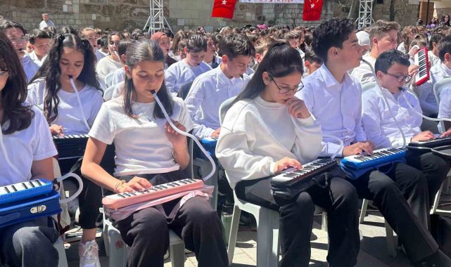 Uğur Mumcu Meydanı'nda gerçekleştirilen etkinlikte öğrenciler, "Türk Marşı", "Bu Gala Daşlı Gala" ve "Çırpınırdı Karadeniz" gibi eserleri melodika eşliğinde seslendirerek izleyenlere duygu dolu anlar yaşattı.