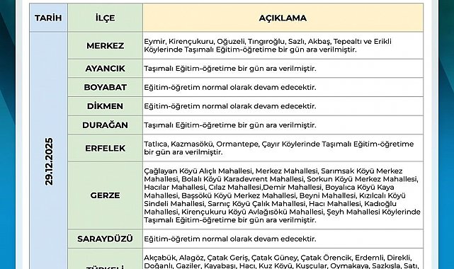 Sinop Valiliğinden yapılan açıklamada, olumsuz hava şartlarının ulaşımda risk oluşturabileceği değerlendirilerek 29 Aralık 2025 Pazartesi günü Ayancık ve Durağan ilçelerinde taşımalı eğitimin tamamen durdurulduğu bildirildi. Merkez ilçe ile birlikte Erfelek, Gerze ve Türkeli'nin bazı bölgelerinde ise taşımalı eğitime kısmi olarak ara verildi. Boyabat, Dikmen ve Saraydüzü ilçelerinde eğitim öğretimin normal şekilde devam edeceği ifade edildi.