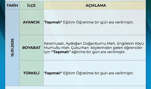 Açıklamada, Boyabat ilçesinin bazı köylerinde de taşımalı eğitime kısmi olarak ara verildiği belirtildi. Taşımalı eğitimin durdurulduğu ilçe ve köylerde görev yapan engelli ve hamile kamu görevlilerinin ise aynı gün idari izinli sayılacağı ifade edildi.