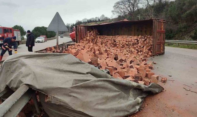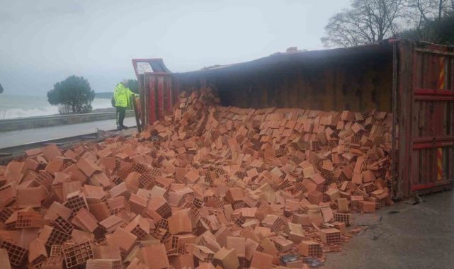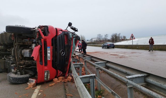 Sinop'un Gerze ilçesinde kontrolden çıkıp devrilen tuğla yüklü kamyonun sürücüsü yaralandı.