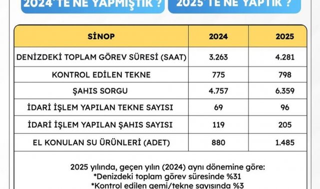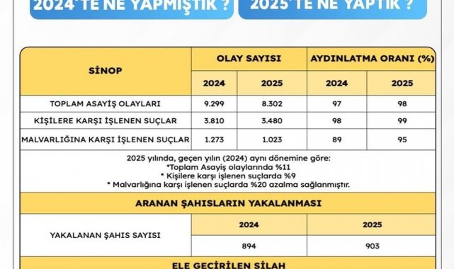 Sinop'un huzur ve güvenliği için 964 emniyet, 782 jandarma ve 40 sahil güvenlik personeli olmak üzere toplam bin 786 personelin gece gündüz görev yaptığını ifade eden Özarslan, 2025 yılında bir önceki yılın aynı dönemine göre toplam asayiş olaylarında yüzde 11, kişilere karşı işlenen suçlarda yüzde 9, mal varlığına karşı işlenen suçlarda ise yüzde 20 azalma sağlandığını, kişilere karşı işlenen suçlarda aydınlatma oranının yüzde 99, mal varlığına karşı suçlarda ise yüzde 95 olduğunu belirtti.