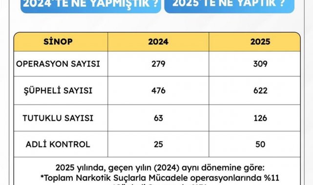 Sinop'ta uyuşturucuyla mücadelede 2025 yılında operasyonlar yüzde 11 artarken, yakalanan şüpheli sayısı yüzde 31, tutuklu sayısı ise yüzde 100 yükseldi.