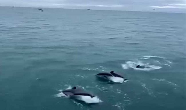 Renkli görüntülerin oluştuğu o anlarda yunuslar, teknenin hızına eşlik ederek adeta görsel bir şov sundu. Yaklaşık birkaç dakika boyunca teknenin çevresinden ayrılmayan yunus sürüsü, daha sonra gözden kayboldu. Balıkçıların büyük ilgiyle izlediği o doğal anlar, anbean kayıt altına alındı.