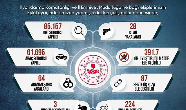 01-30 Eylül tarihleri arasında yapılan denetimlerde 85 bin 157 kişinin genel bilgi toplama (GBT) sorgusu ile 61 bin 695 araç kontrol edildi. Umuma açık 224 iş yeri denetlendi. Çalışmalarda 391,7 gram uyuşturucu madde, 87 adet sentetik ecza ele geçirildi.