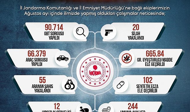 Sinop Valiliği, İl Emniyet Müdürlüğü ve İl Jandarma Komutanlığı'nın ağustos ayına ait güvenlik ve denetim faaliyetlerini kamuoyu ile paylaştı.