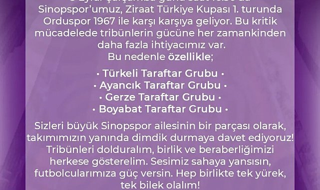 Kuzeyliler Taraftar Grubu tarafından yapılan açıklamada, "3 Eylül Çarşamba günü saat 16.30'da Sinopspor'umuz, Ziraat Türkiye Kupası 1. Turunda Orduspor 1967 ile karşı karşıya geliyor. Bu kritik mücadelede tribünlerin gücüne her zamankinden daha fazla ihtiyacımız var. Bu nedenle özellikle, Türkeli Taraftar Grubu, Ayancık Taraftar Grubu, Gerze Taraftar Grubu, Boyabat Taraftar Grubu Sizleri büyük Sinopspor ailesinin bir parçası olarak, takımımızın yanında dimdik durmaya davet ediyoruz! Tribünleri dolduralım, birlik ve beraberliğimizi herkese gösterelim. Sesimiz sahaya yansısın, futbolcularımıza güç versin. Hep birlikte tek yürek, tek bilek olalım" denildi.