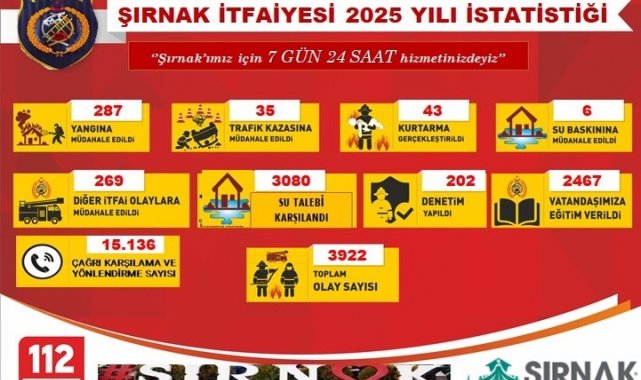 Resmi verilere göre Şırnak itfaiyesi, 2025 yılı boyunca yalnızca yangınlarla değil, çok sayıda farklı acil durumla da mücadele etti. Kent genelinde çıkan 287 yangın kısa sürede kontrol altına alınırken, 35 trafik kazasında araç içerisinde sıkışan vatandaşlar profesyonel ekiplerce kurtarıldı. Ayrıca 43 kurtarma operasyonu başarıyla tamamlandı, 6 su baskını büyümeden önlendi. Farklı kategorilerde yaşanan 269 olaya da hızlı ve etkili şekilde müdahale edildi. Toplamda 3 bin 922 olay, itfaiye ekiplerinin omuzladığı büyük sorumluluğu gözler önüne serdi. 2025 yılı, su ve altyapı çalışmaları açısından da yoğun geçti. İtfaiye ekipleri, kent genelinde gelen 3 bin 80 su talebine anında karşılık verdi. Muhtemel riskleri en aza indirmek amacıyla 202 ayrı denetim gerçekleştirilerek iş yerleri, kamu binaları ve yaşam alanları tek tek kontrol edildi.