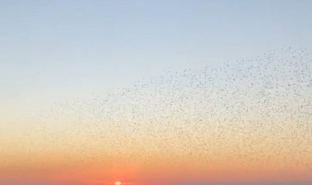 İlçede, binlerce kuşun bir araya gelerek gün batımında kanat çırpması görsel şölen oluşturdu. Dün, kuşların görsel şöleni bir vatandaş tarafından cep telefonu kamerasıyla çekildi.