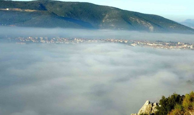 Muğla'nın Menteşe ilçesi, sabah saatlerinde etkili olan yoğun sisle adeta masalsı bir atmosfere büründü. Doğal güzelliklerin üzerini bembeyaz bir örtü gibi kaplayan sis bulutu, kenti tabloyu andıran manzaralarla süsledi.