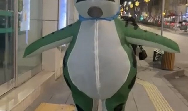 Şişme kurbağa kostümüyle caddede dolaştı, hem şaşırttı, hem gülümsetti