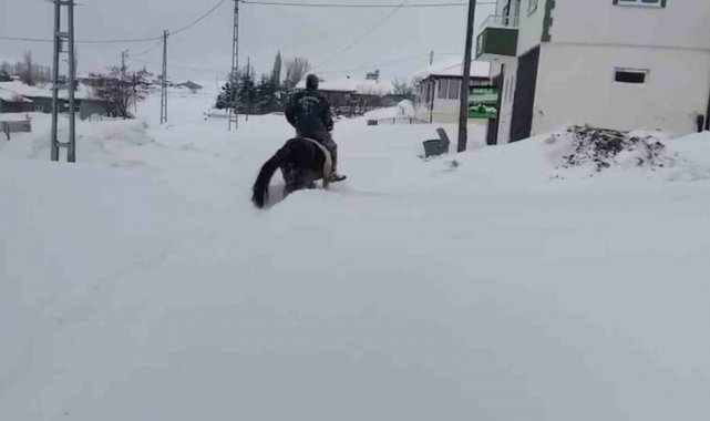 Sivas'ın Altınyayla ilçesi Altınyurt Mahallesi'nde yaşayan Ruşan Atalay, karla kaplanan köyde yollar araç ulaşamına kapandığından ağılına ulaşmak için ata binmek zorunda kaldı. Atalay, atla ulaşabildiği ağıldaki küçükbaş hayvanları dışarı çıkardı. Zorlu şartlar altında hayvanlarını yemleyen Atalay, o anları cep telefonuyla görüntüledi.