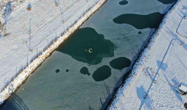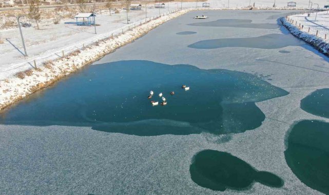 Sivas'ta soğuk hava etkisini gösterdi, ördeklerin olduğu gölet kısmen dondu