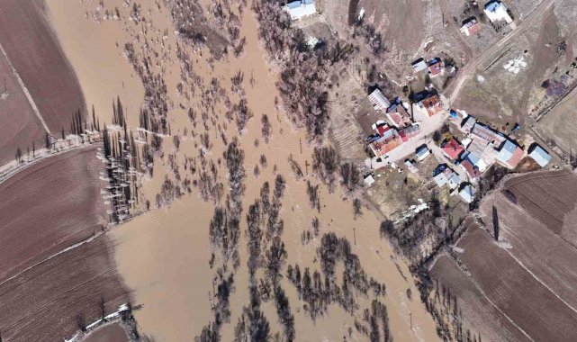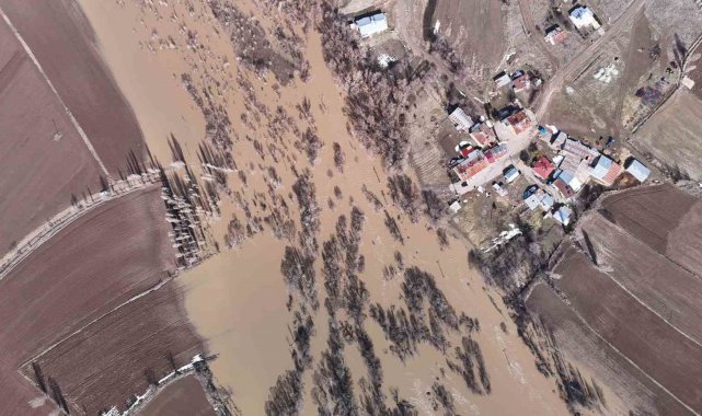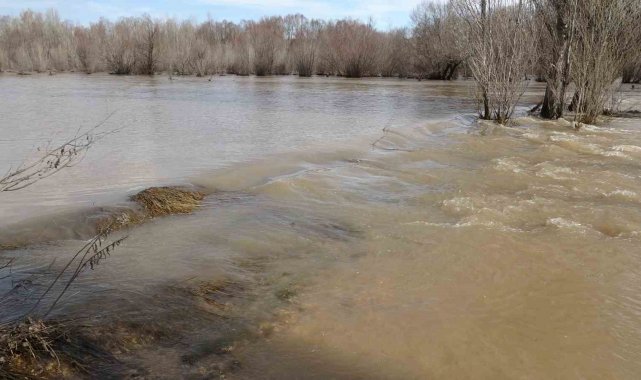 Sivas'ta eriyen kar sularıyla debisi yükselen Yıldız Irmağı taştı, merkeze bağlı İsmail Bey Çiftliği köyü yolu tamamen sular altında kaldı.