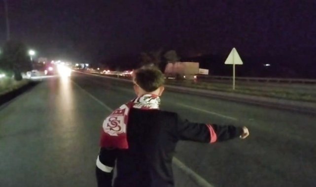 Sivasspor taraftarı iki genç, deplasmanda takımlarını desteklemek için ilginç bir yönteme başvurdu. Ulaşım desteği sağlanmadığı için İstanbul'a otostopla gitmeye çalışan gençler, o anları cep telefonu ile çekerek sosyal medyada paylaştı.