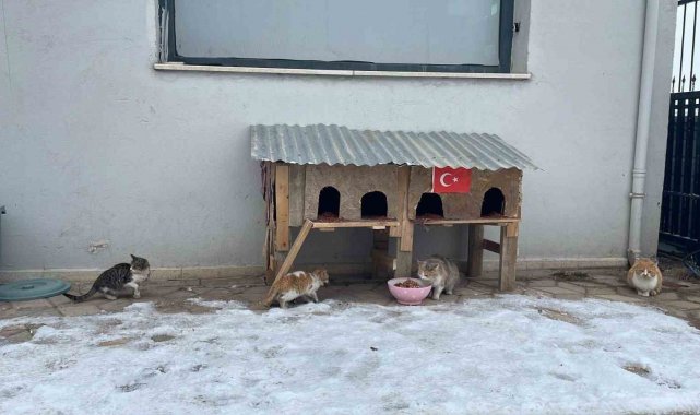 Dondurucu soğukların yaşandığı Elazığ'da sokak hayvanları da zor günler geçiriyor. Sivrice İlçe Emniyet Müdürlüğü'nde görev yapan personel, soğuk havalardan olumsuz etkilenen kediler için kendi imkanlarıyla kedi evi yaparak örnek bir hareket sergiledi. Kedi evinin içerisine yem ve su bırakan polis memurları, belirli aralıklarla yem takviyesi yaparak hem temel ihtiyaçlarını karşılıyor hem zarar görmemeleri için güvende tutmaya çalışıyor.