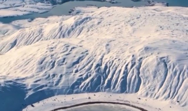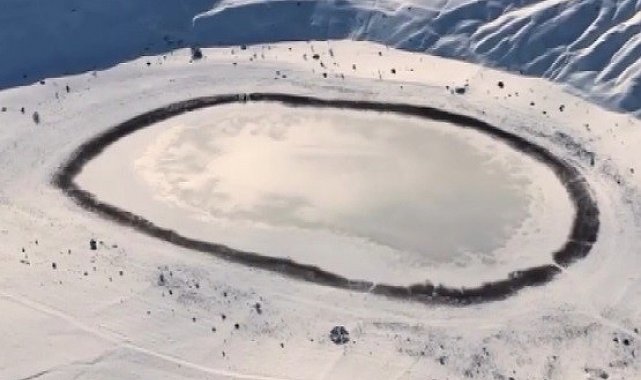 İliç Belediye Başkanı Mehmet Elçi'nin paylaştığı görüntüler ilgi görürken, yaklaşık 350 metre çapındaki ve jips erimesiyle oluşan göl, kış mevsiminde farklı bir görünüme büründü.