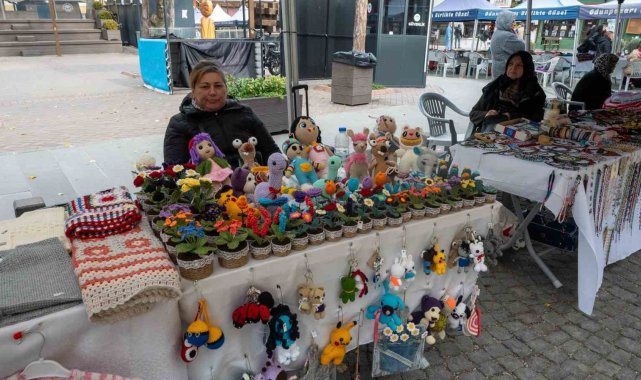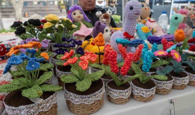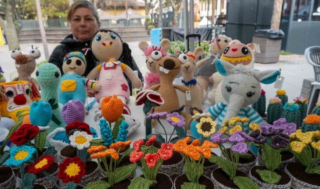 Çocukluk tutkusunu el emeğine dönüştüren ev hanımı Şükran Karol, soğuk havaya rağmen tezgahının başından ayrılmayarak rengarenk örgü çiçek ve oyuncaklarını vatandaşlarla buluşturuyor.