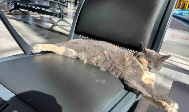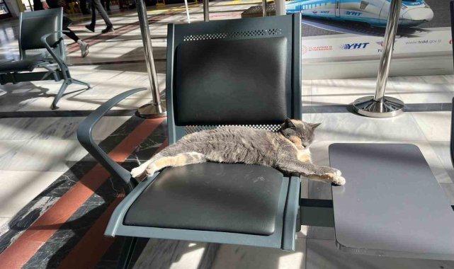 Havaların soğumasıyla birlikte tren garının bekleme salonu, sevimli bir misafiri ağırladı. Dışarıdaki soğuktan korunmak için içeri girdiği düşünülen bir kedi, yolcular için ayrılan koltuklardan birini mesken tuttu. Güneş ışığının vurduğu koltuğa boylu boyunca uzanan patili misafir, etraftaki kalabalığa ve gürültüye aldırış etmeden derin bir uykuya daldı. Kedinin bu huzurlu anları, garda tren bekleyen vatandaşlar tarafından ilgiyle izlendi.