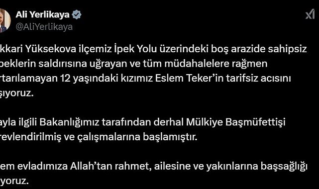 "Hakkari Yüksekova ilçemiz İpek Yolu üzerindeki boş arazide sahipsiz köpeklerin saldırısına uğrayan ve tüm müdahalelere rağmen kurtarılamayan 12 yaşındaki kızımız Eslem Teker'in tarifsiz acısını yaşıyoruz. Olayla ilgili Bakanlığımız tarafından derhal Mülkiye Başmüfettişi görevlendirilmiş ve çalışmalarına başlamıştır. Eslem evladımıza Allah'tan rahmet, ailesine ve yakınlarına başsağlığı diliyoruz."