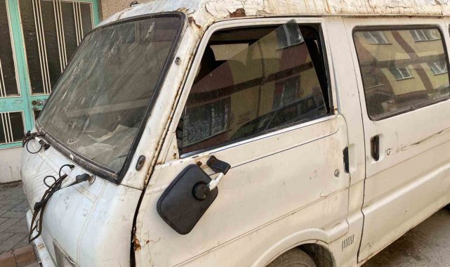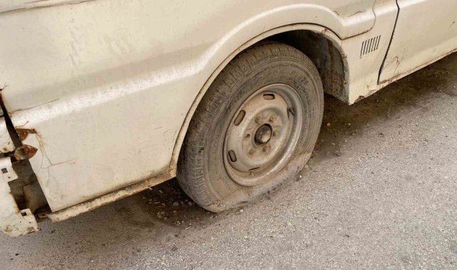 Lastikleri patlamış ve âtıl durumdaki panelvan tarzı araç, sokakta göze hoş olmayan görüntü oluşturuyor.
