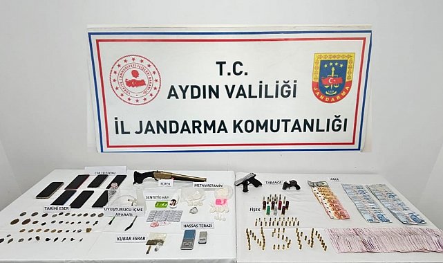 Aydın İl Jandarma Komutanlığı Narkotik Suçlarla Mücadele Şube Müdürlüğü ve Söke İlçe Jandarma Komutanlığı ekiplerince, 24 Mart 2026 günü Söke ilçesinde yürütülen çalışmalar kapsamında uyuşturucu ve tarihi eserlere yönelik operasyon düzenlendi. Operasyonda, şüphelilerin ikametlerinde yapılan aramalarda; 180 gram metamfetamin, 20 gram esrar, 60 adet sentetik ecza hapı, 2 adet hassas terazi, 3 adet bong aparatı, 2 adet tabanca, 1 adet kırma av tüfeği, 93 adet tabanca fişeği, 55 bin TL nakit para ile birlikte 10 adet tarihi para, 19 adet sikke, 13 adet tarihi obje, 1 adet tarihi yüzük ve Bizans dönemine ait 1 adet tarihi eser ele geçirildi. Ayrıca 6 adet cep telefonuna da el konuldu.