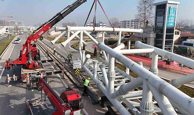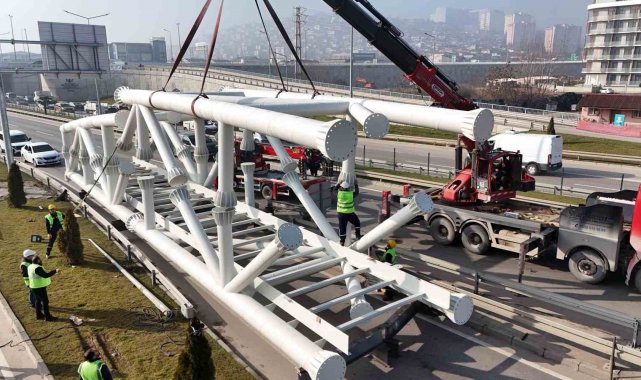 Kocaeli Büyükşehir Belediyesi, Solaklar Kavşağı'na nefes aldıracak projelerinden biri olan yaya üst geçidinin yapımına devam ediyor. Kocaeli'nin en uzun tek açıklıklı modern üst geçit inşasında ilerleme oranı yüzde 75'e ulaştı. Kocaeli Büyükşehir Belediyesi Fen İşleri Dairesi Başkanlığı tarafından yapımı devam eden Solaklar Yaya Üst Geçidi'nin çelik konstrüksiyon montaj çalışmaları başladı. Üst geçidin toplam 10 parçadan oluşan 63 metre uzunluğunda ve 120 ton ağırlığındaki çelik aksamının dördünün montajı tamamlandı. Tırlarla getirilen çelik aksamlar, çevrede alınan güvenlik önlemlerinin ardından vinç yardımıyla yola indirildi. Yerde 4 parçanın montajı özenle yapılarak birleştirildi. Diğer 6 parçanın birleştirilmesiyle üst geçidin çelik konstrüksiyonu tek parça halinde yerine monte edilecek. Montaj çalışmalarının ardından tabliye betonu dökülecek ve andezit plak kaplama imalatı yapılarak üst geçit vatandaşların hizmetine açılacak.