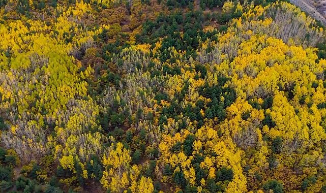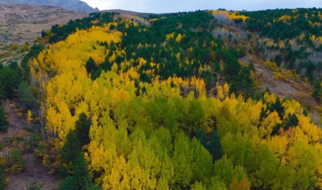 Erzincan'da sonbahar mevsiminde dağlarda renk cümbüşü oluşturan ağaçlar farklı bir güzelliğe büründü. Munzur Dağlarının yamacında oluşan manzara, doğa fotoğrafçısı Emrah Karakoç tarafından droneyle görüntülendi. İlkbaharda yemyeşil görüntüsüyle bölgeye ayrı renk katan farklı türdeki ağaçların yaprakları, sonbaharın gelmesiyle sararıp dökülmeye başladı. Sarı, kırmızı, mor ve yeşil renklere dönüşen ağaçlar, göz alıcı güzellikleriyle görenlerin ilgisini çekiyor.