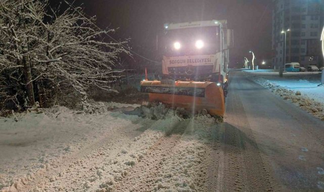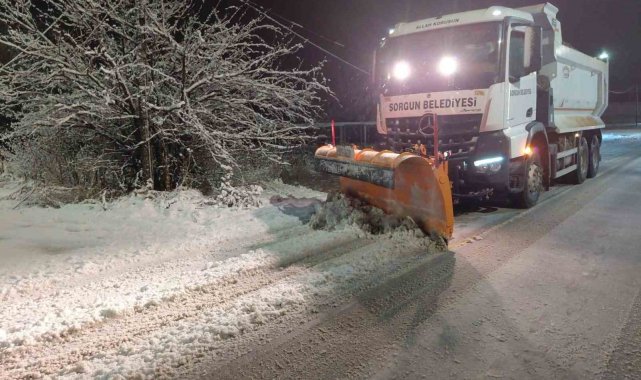 Gece etkisini göstermeye başlayan kar yağışının ardından Sorgun Belediyesi ekipleri, gece ve sabahın ilk ışıklarıyla birlikte kar küreme ve tuzlama çalışmalarına başladı.