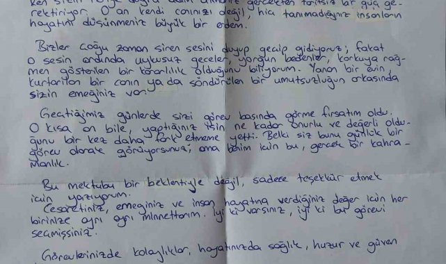 Mektubu kaleme alan 12. Sınıf öğrencisi Belinay Çakıcı itfaiye ekiplerini takdir duygusunu ifade etmek için mektup yazdığını söyledi. Çakıcı, "Olumlu düşünen insanların fazla olduğunu görüyorum. Bunu paylaşmak istedim. Okuluma ziyarete geldikleri için çok mutlu oldum. Hiç beklemiyordum" diyerek hislerini ifade etti.
