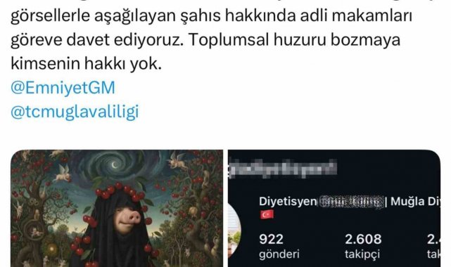 Muğla'da sosyal medyada paylaşılan ve kamuoyunda tartışmalara yol açan görsel tepkilerin odağı oldu. Yapay zeka ile oluşturulduğu belirtilen ve bazı kesimler tarafından 'çarşaf giydirilmiş domuz figürü' olarak nitelendirilen görsel, Muğla'da diyetisyenlik yaptığı öğrenilen O.K.'ye ait sosyal medya hesabından paylaşıldı. Paylaşıma yönelik tepkiler üzerine sosyal medya hesabından açıklama yapan Eğitim Bir-Sen Muğla Şube Başkanı Önder Uçak, söz konusu içeriğin İslami değerlere ve kadınların kıyafet tercihine hakaret içerdiğini belirterek, adli makamları göreve davet etti. Uçak, "Toplumsal huzuru bozmaya kimsenin hakkı yok" ifadelerini kullandı.