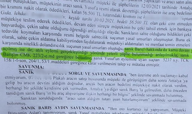 Samsun'da yaşayan Y.B. ve D.A., 2021 yılında Antalya'da ikamet eden B.A. ile internet üzerinden araç alım satımı için anlaştı. Satış sonrası verilen çekin sahte olduğunun anlaşılması üzerine mağdur B.A., şikâyetçi oldu. Dolandırıcılıkla ilgili yürütülen soruşturmada şahıslara ulaşılamayınca, Y.B.'nin Facebook hesabında ortak arkadaş olarak görülen Barış Aydın'ın fotoğrafı mağdura gösterildi ve teşhis bu fotoğraf üzerinden yapıldı.