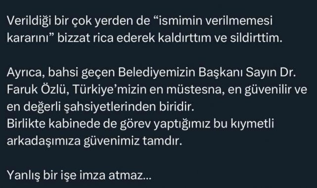 Konunun gündem olmasının ardından X hesabından açıklamada bulunan Eski İçişleri Bakanı Süleyman Soylu, Düzce Belediye Başkanı Dr. Faruk Özlü'ye desteğini dile getirerek, "Yalandan hiç yorulmaz mısınız? Bugüne kadar ismim onlarca yere verilmek istendi. Ancak kişisel bir karar olarak, ismimin hiçbir yere verilmesini istemedim. Verildiği birçok yerden de 'ismimin verilmemesi kararını' bizzat rica ederek kaldırttım ve sildirttim. Ayrıca, bahsi geçen Belediyemizin Başkanı Dr. Faruk Özlü, Türkiye'mizin en müstesna, en güvenilir ve en değerli şahsiyetlerinden biridir. Birlikte kabinede de görev yaptığımız bu kıymetli arkadaşımıza güvenimiz tamdır. Yanlış bir işe imza atmaz" dedi.