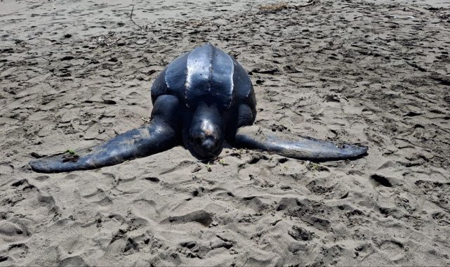 Sakarya'nın Karasu ilçesinin sahiline ölü olarak vuran ve soyu tükenmeyle karşı karşıya kalan deri sırtlı deniz kaplumbağasının boyutu görenleri hayret düşürdü.