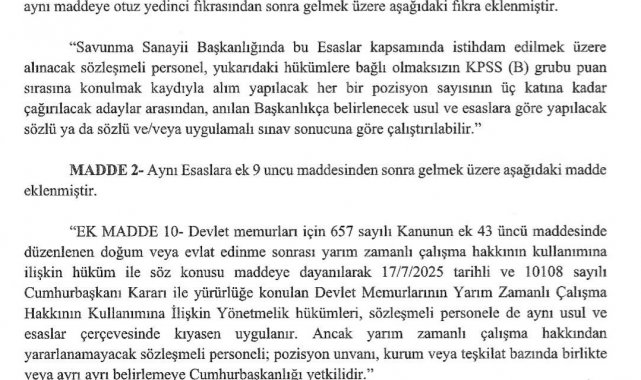Sözleşmeli Personel Çalıştırılmasına İlişkin Esaslar'da yapılan değişiklikle doğum ve evlat edinme sonrası yarı zamanlı çalışma hakkının sözleşmeli personeli de kapsaması yönünde düzenleme, Cumhurbaşkanı Recep Tayyip Erdoğan'ın imzasıyla Resmi Gazete'de yayımlanarak yürürlüğe girdi. Aile ve Sosyal Hizmetler Bakanı Mahinur Özdemir Göktaş konuya ilişkin sosyal medya hesabından yaptığı açıklamada, "'Aile ve Nüfus On Yılı' vizyonumuz doğrultusunda her zaman ailelerimizin yanında olmaya, çalışma hayatında iş-aile dengesini güçlendirmeye devam edeceğiz. Ülkemiz, milletimiz ve ailelerimiz için hayırlı olsun" ifadelerini kullandı.