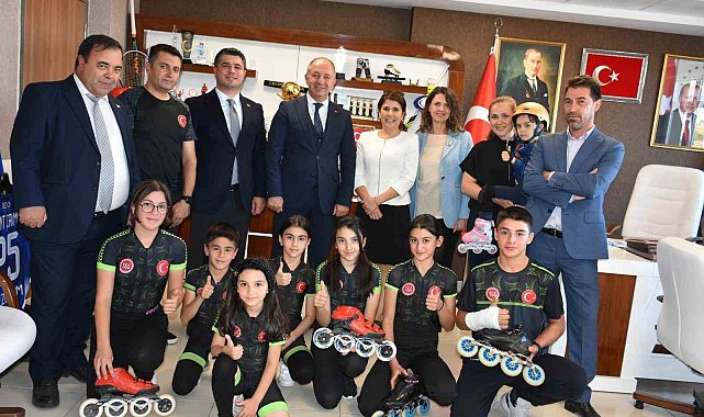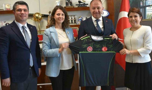 Kulüp Başkanı Buket Aydın, ziyaret anısına İl Müdürü Levent Çakmur'a Speed Skating Spor Kulübünün formasını hediye ederek takımın maçlarına davet etti.
