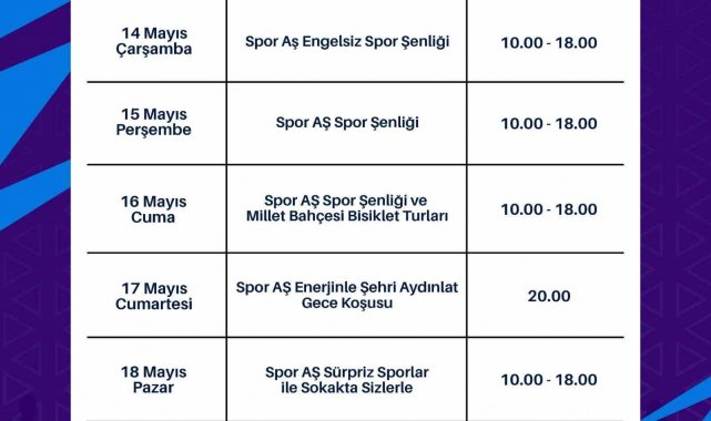 14 Mayıs Çarşamba günü saat 10.00'da başlayan Enerji Haftası Etkinliklerinin ilk gününde Spor A.Ş. Engelsiz Spor Şenliği düzenlenirken 15 Mayıs Perşembe günü Spor A.Ş. Spor Şenliği, 16 Mayıs Cuma günü Spor A.Ş. Spor Şenliği & Millet Bahçesi Bisiklet Turları yapılacak. Spor, eğlence ve enerji dolu etkinlikler kapsamında 17 Mayıs Cumartesi günü Spor A.Ş. Enerjinle Şehri Aydınlat Gece Koşusu ve 18 Mayıs Pazar günü ise Spor A.Ş. Spor Şenliği & Sürpriz Sporlar ile Sokakta Sizlerle aktiviteleri düzenlenecek.