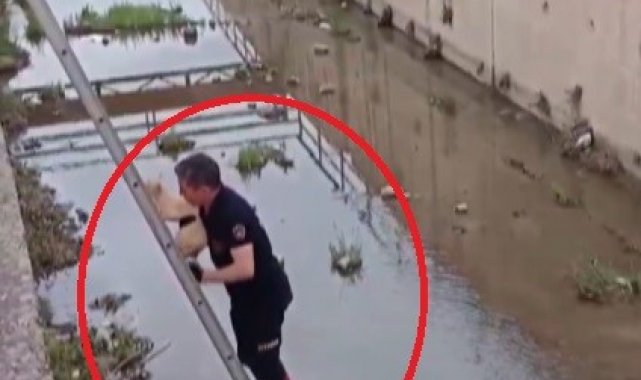 Su kanalında mahsur kalan kedinin yardımına itfaiye ekipleri koştu