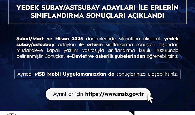 Milli Savunma Bakanlığından yapılan açıklamada, "Şubat/Mart ve Nisan 2025 dönemlerinde silahaltına alınacak yedek subay/astsubay adayları ile erlerin sınıflandırma sonuçları dışarıdan müdahaleye kapalı yazılım vasıtasıyla sınıflandırma kurulu huzurunda belirlenmiştir. Sonuçları; e-Devlet kapısından, askerlik şubelerinden ve MSB Mobil uygulamasından öğrenebilirsiniz" denildi.