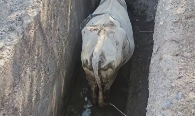 Sulama kanalına düşen inek, 5 saatlik çalışmayla kurtarıldı
