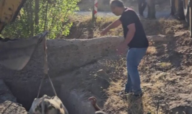 Sivas'ın Zara ilçesinde sulama kanalına düşen inek, köylülerin uzun uğraşları sonucu kepçe yardımıyla kurtarıldı.
