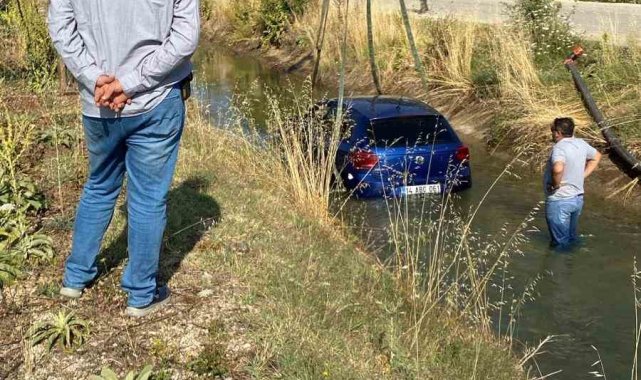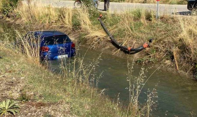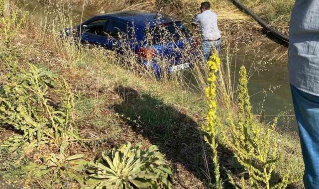 Sulama kanalına uçan otomobil, vinçle çıkarıldı