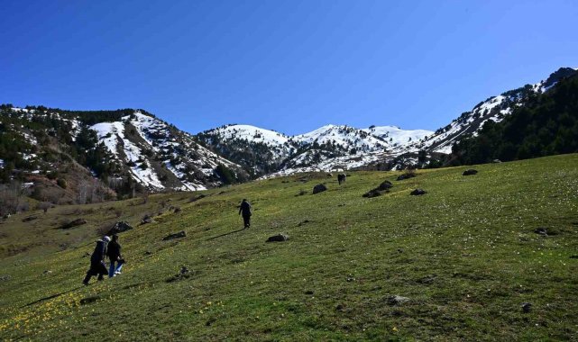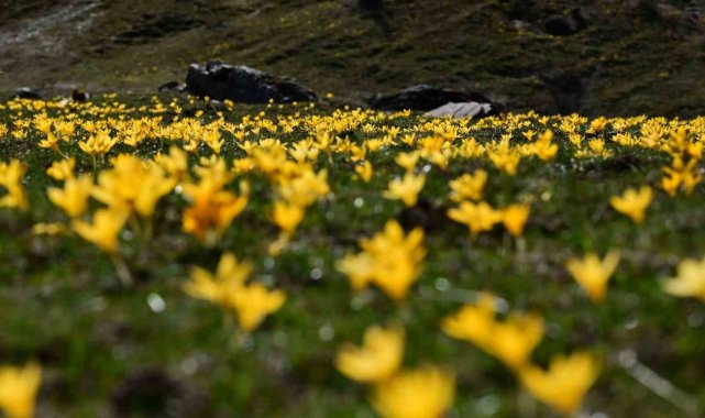 Karların ardından fışkıran bu renkli çiçekler, vadi boyunca metrelerce uzanan doğal bir halı görüntüsü oluşturarak görenleri kendine hayran bıraktı.