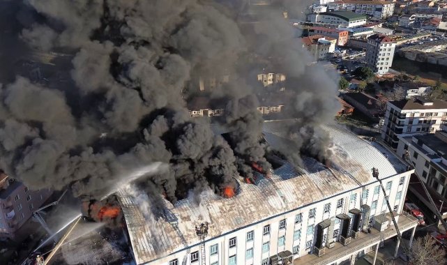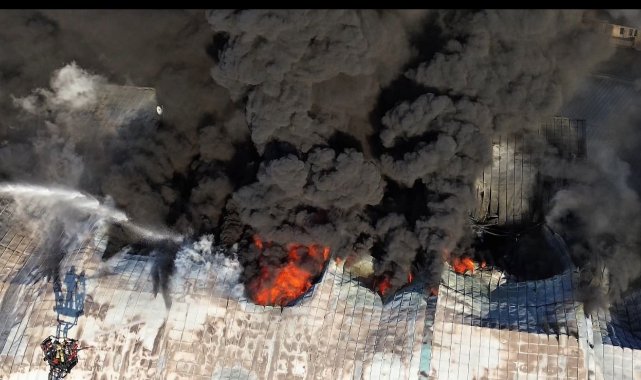 Sultanbeyli'nde 5 katlı iş merkezinde bulunan tekstil atölyesinde çıkan yangın dron ile havadan görüntülendi.